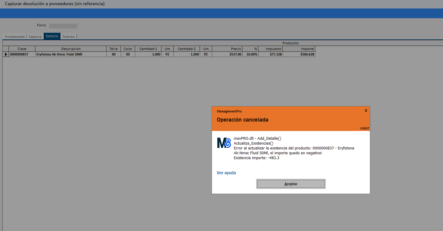 Buen dia, intenta dar salida por devolución a proveedor y me sale esta leyenda, ya corrobore la existencia y esta correcto, no me permite dar la baja. Dice que el precio no es correcto o algo asi, ya intente ponerle precio costo, 0 y nada. Muchas gracias