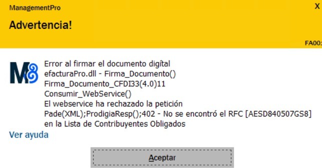 Padre(XML);ProdigiaResp();402 - No se encontró el RFC [AESD840507GS8] en la Lista de Contribuyentes Obligados"