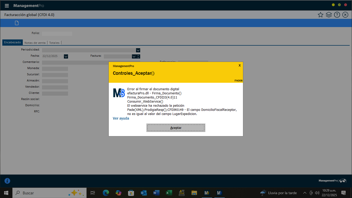 Celso Sánchez 6 d Granel Dulcerias ERP ERROR AL GENERAR LA FACTURA GLOBAL EN SUCURSAL ERROR AL GENERAR LA FACTURA GLOBAL EN SUCURSAL Me gusta Celso Sánchez 6 d EL SISTEMA ME MANDA EL SIGUIENTE ERROR: Me gusta Axel Díaz 6 d ¡Hola! Bienvenido al soporte técnico de ManagementPro :tada: Es un gusto atender tu consulta. Estamos aquí para resol... Ver mas Me gusta Celso Sánchez 6 d GRACIAS... SI QUEDO SOLUCIONADO Me gusta