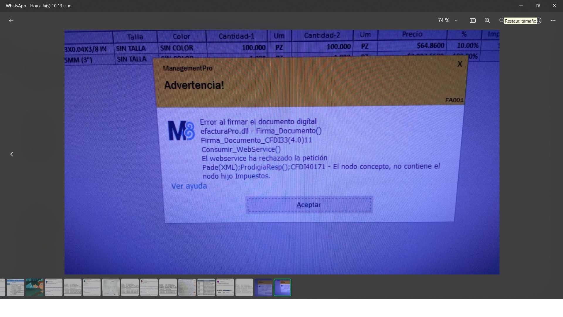 Gonzalo Leon 6 d SAUTEK ERP error firmar factura buenos dias. tengo este error al firmar una factura, me pueden apoyar Me gusta Axel Díaz 6 d ¡Hola! Bienvenido al soporte técnico de ManagementPro :tada: Es un gusto atender tu consulta. Estamos aquí para resol... Ver mas Me gusta Axel Díaz 5 d ¡Hola! :blush:Esperamos que te encuentres muy bien.Hemos intentado contactarte para dar seguimiento a tu consult... Ver mas Me gusta
