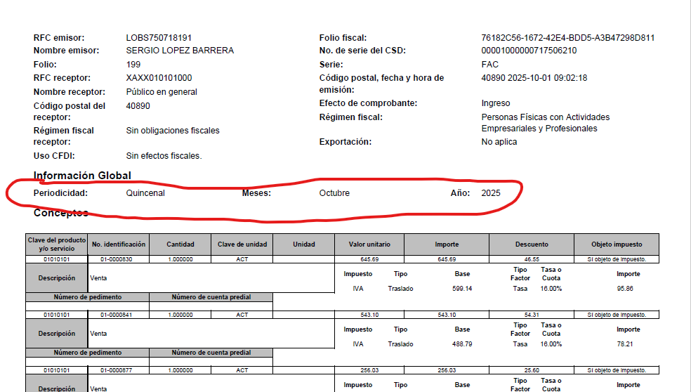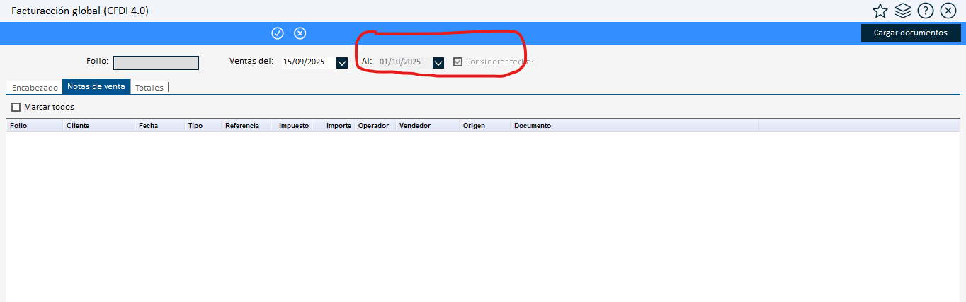 Buen día, el día de hoy estoy realizando unas facturas globales ya que ayer en la tarde no tuvimos internet ni electricidad, el problema que las timbre y me aparecen que corresponden al mes de octubre, ya intente cambiar la fecha de termino para dejarlo del 15 al 30 de sep pero no me lo permite, se puede hacer algo?