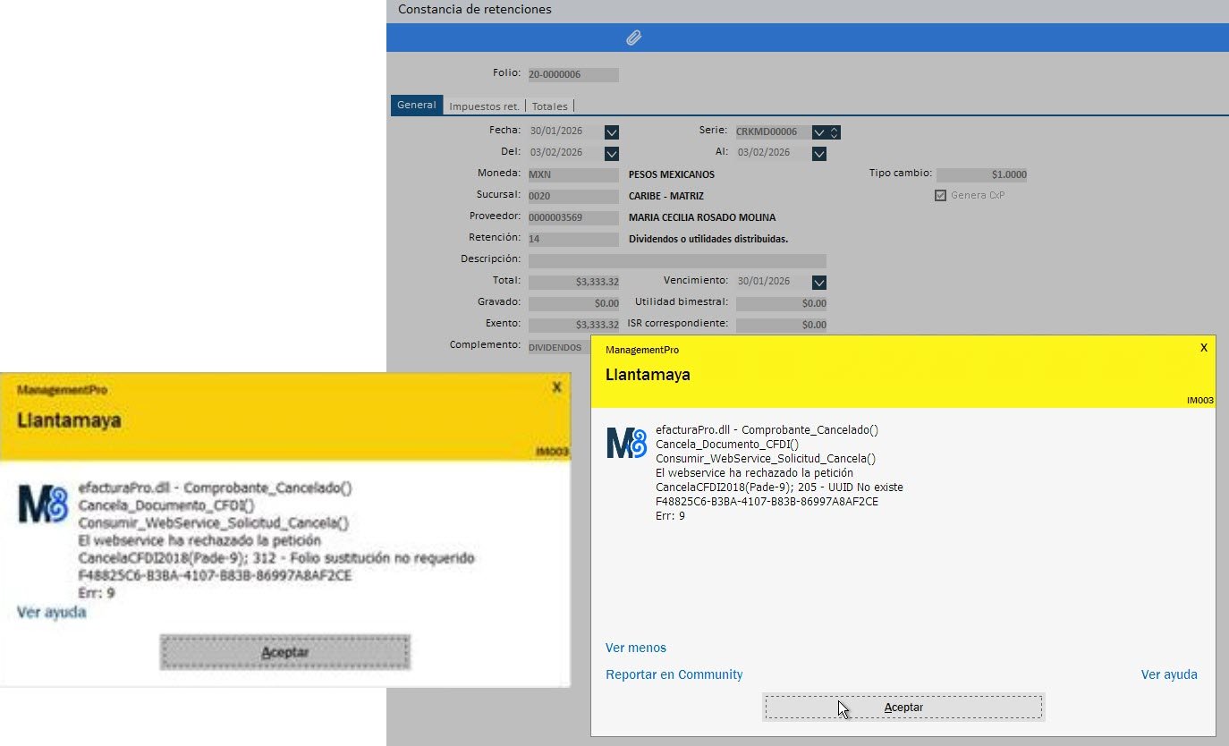 Pantalla IM003 - CONSTANCIA DE RETENCIONES: Al intentar cancelar el CDFI de retención usando la causa "03 - No se llevó a cabo la operación", se recibe un mensaje que indica que se ha rechazado la petición de cancelación. Folio de sustitución no requerido (UUID del documento fiscal). Si se elige la causa "02 - Comprobante emitido con errores, sin relación", se recibe el mensaje "El UUID no existe (UUID del documento) Err: 9". En ambos casos el do... Ver mas