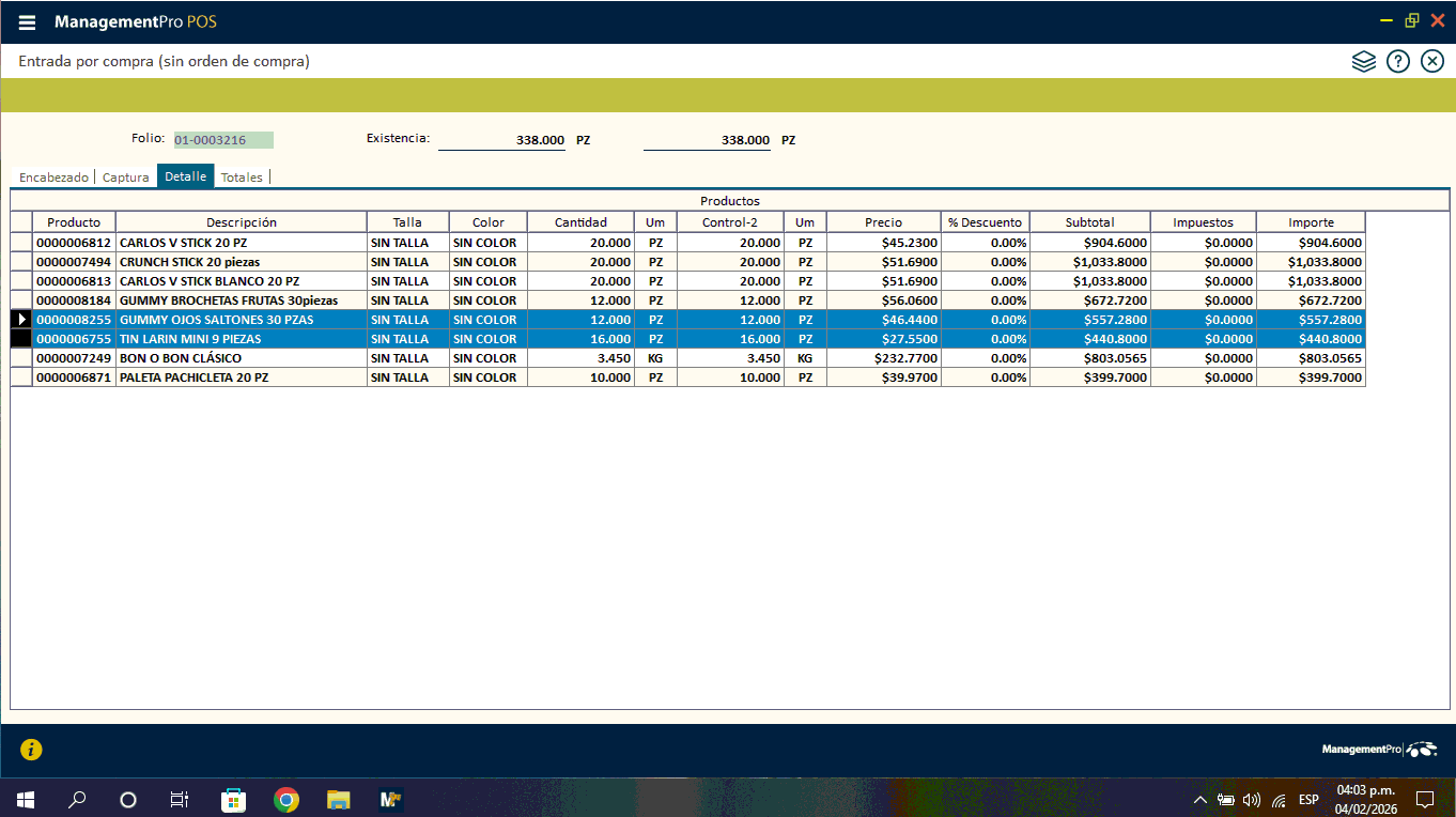 comprasPOS.dll - Cancelar_Compra()movPRO.dll - Cancelar_Documento()movPRO.dll - Cancelar_Movimiento()movPRO.dll - Add_Detalle()Actualiza_Existencias()No hay existencia suficiente del producto: 0000006755, para efectuar el movimiento!Existencia cantidad-1: 7.000 movimiento: -16Existencia cantidad-2: 7.000 movimiento: -16Existencia Cantidad-costo: 7 movimiento: -16Empresa actual: SUCURSAL: 0001ALMACEN: 0001
