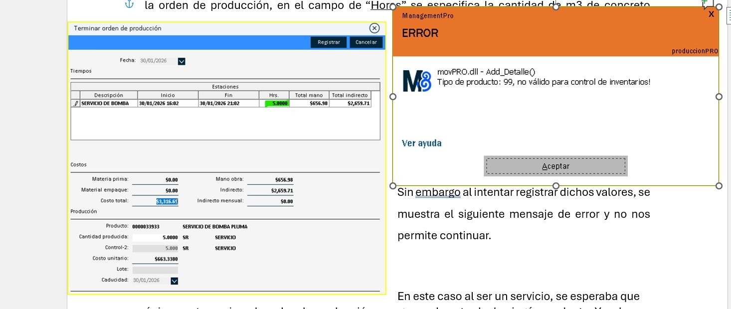 Buenas tardes! por necesidad de nuestra operación hemos habilitado un producto de tipo servicio llamado "servicio de bomba pluma" que va de la mano con la venta de concreto premezclado, son unas pipas que llegan a la obra y suministran el concreto a techo u cualquier colado, a 1, 2do, 3er nivel, etc. dicho suministro se cobra segun los m3, a eso le llamamos servicio de bomba. su caracteristica principal es que es un costo estandar y debe pasar p... Ver mas